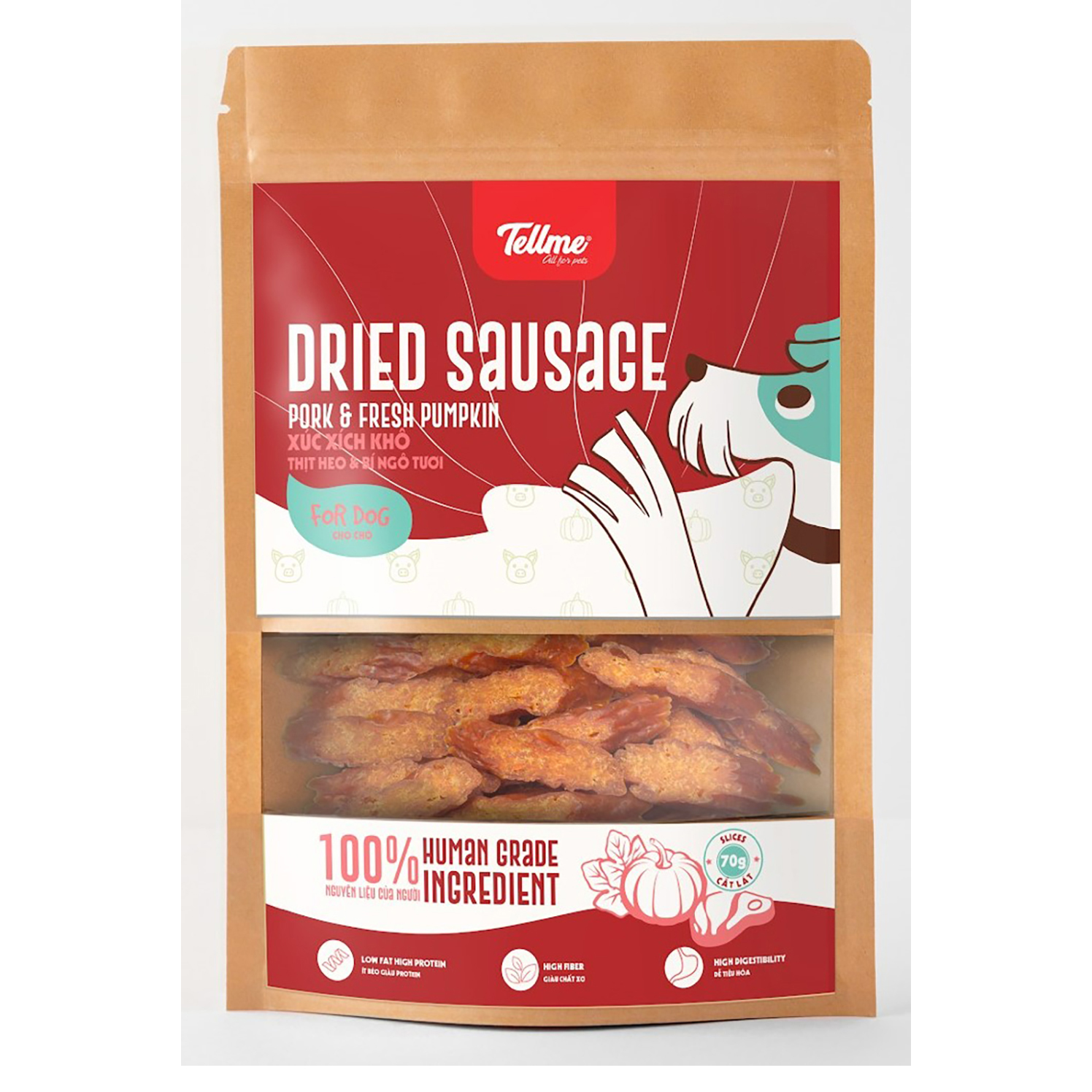 Thức ăn Tellme dành cho chó dạng xúc xích khô cắt lát vị thịt heo và bí ngô tươi 70g